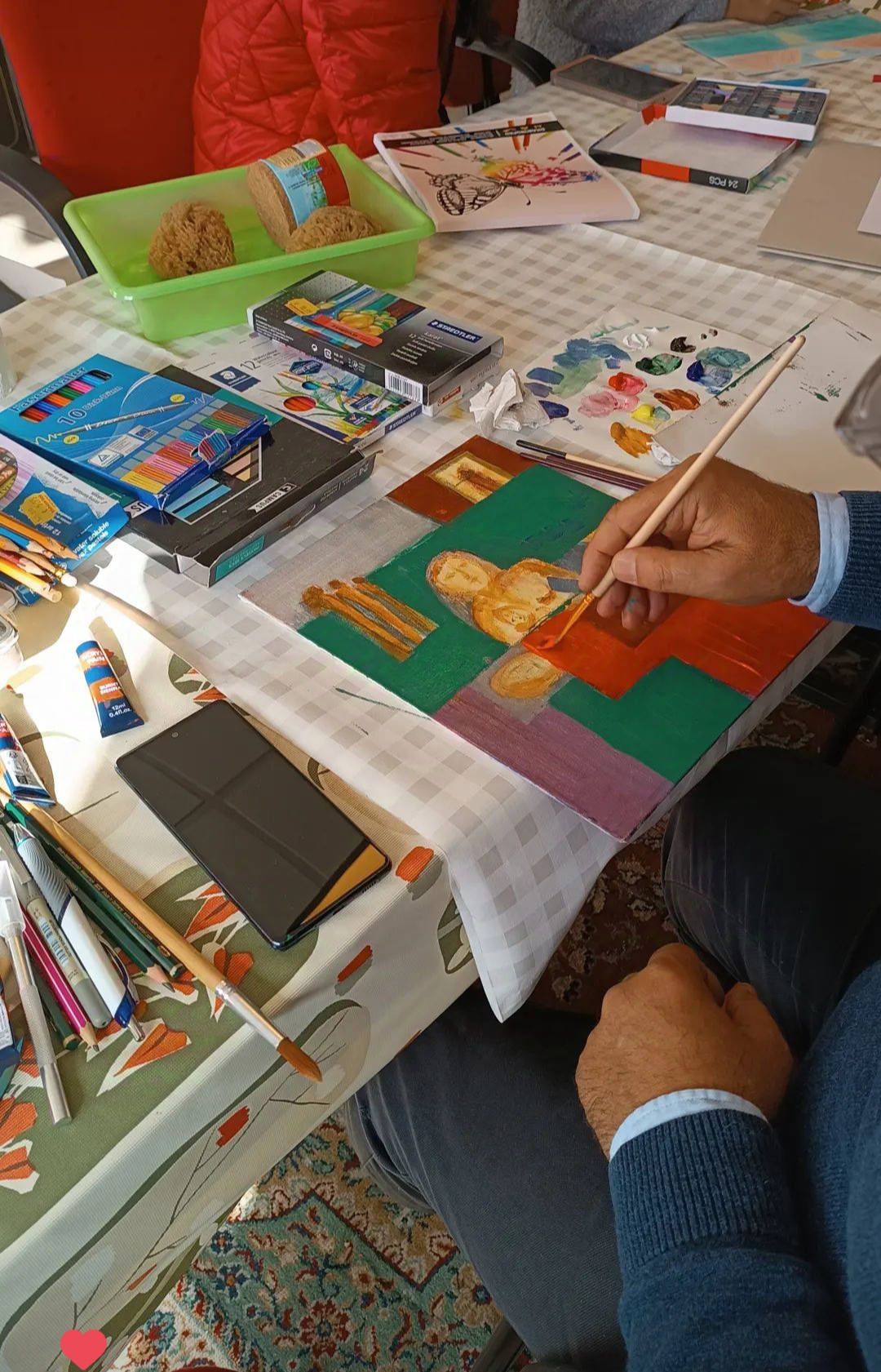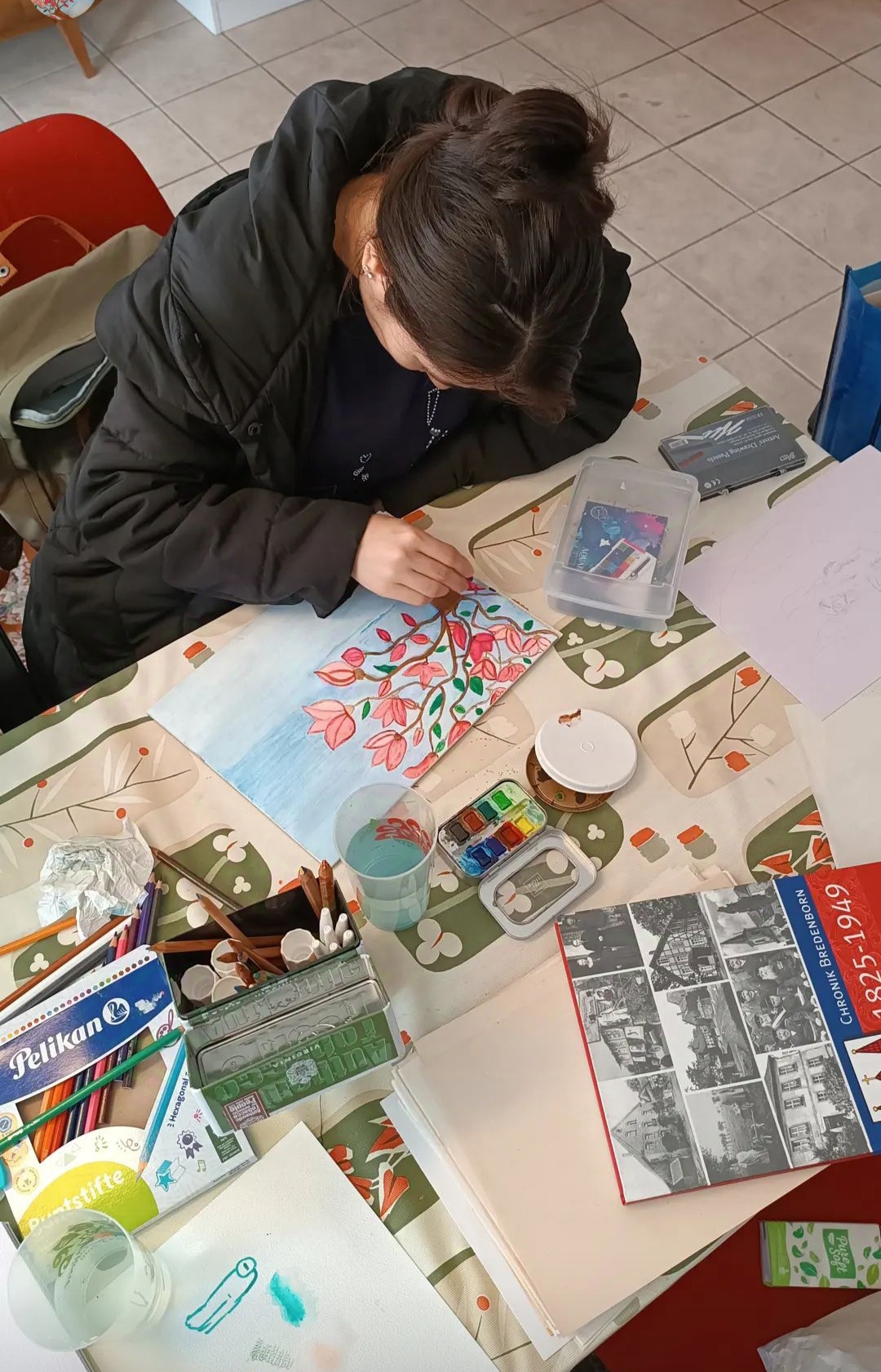 Christel hat Utensilien für alle Mal- und Zeichentechniken: Kohle, Bleistift, Wasserfarben, Aquarell, Ölfarben… Im letzten Jahr wurden die Bilder übrigens für den Kalender der Heimatstube 2024 gemalt und die besten dort auch Monat für Monat veröffentlicht. Ein toller Erfolg, auch für die Zusammenarbeit.